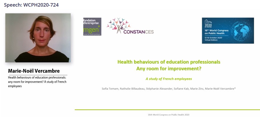Les professionnels de l’éducation, au premier rang desquels, les enseignants, sont moins susceptibles d’adopter des comportements de santé à risque que les autres salariés, à profil sociodémographique et de santé similaire. Pour autant, des marges de progression existeraient, via la promotion d’un mode de vie actif. Telle est la conclusion d’une étude menée par la Fondation d’entreprise MGEN pour la santé publique dans la cohorte épidémiologique « généraliste » Constances. Les comportements de santé étant un levier important de santé publique, ce résultat met en lumière le rôle des professionnels de l’éducation, comme modèle et source de transmission, dans le domaine de l’éducation à la santé. Ces réflexions et analyses seront présentées par Marie-Noël Vercambre au 16th World Congress on Public Health (WCPH) qui se tiendra de façon virtuelle du 12 au 16 octobre 2020 (wcph2020.com/index.php). Voir la page axe « Santé et travail ».